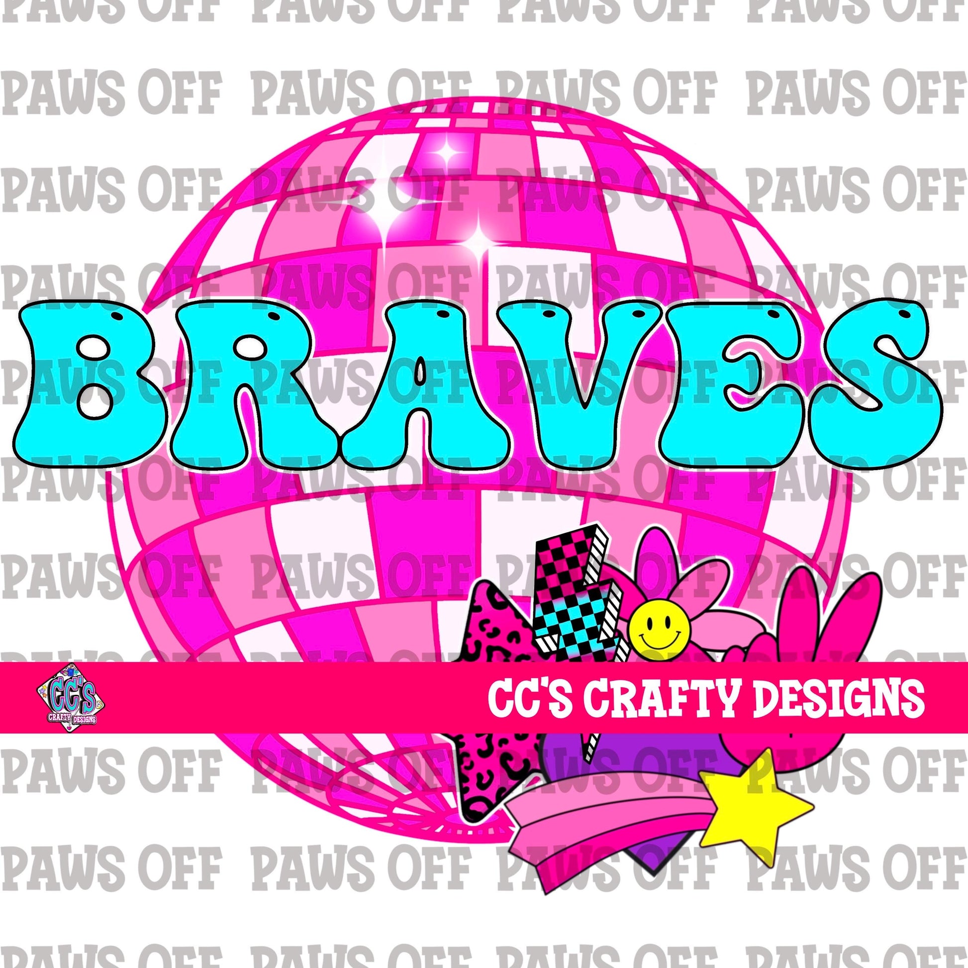 Bring the funky retro vibes to your next project with this Braves digital PNG! Featuring a vibrant pink disco ball, a groovy mix of peace signs, stars, checkered patterns, and a playful smiley face—this design is perfect for showing off school spirit with style and flair. Ideal for cheer teams, school merch, sublimation, t-shirts, tumblers, and more!