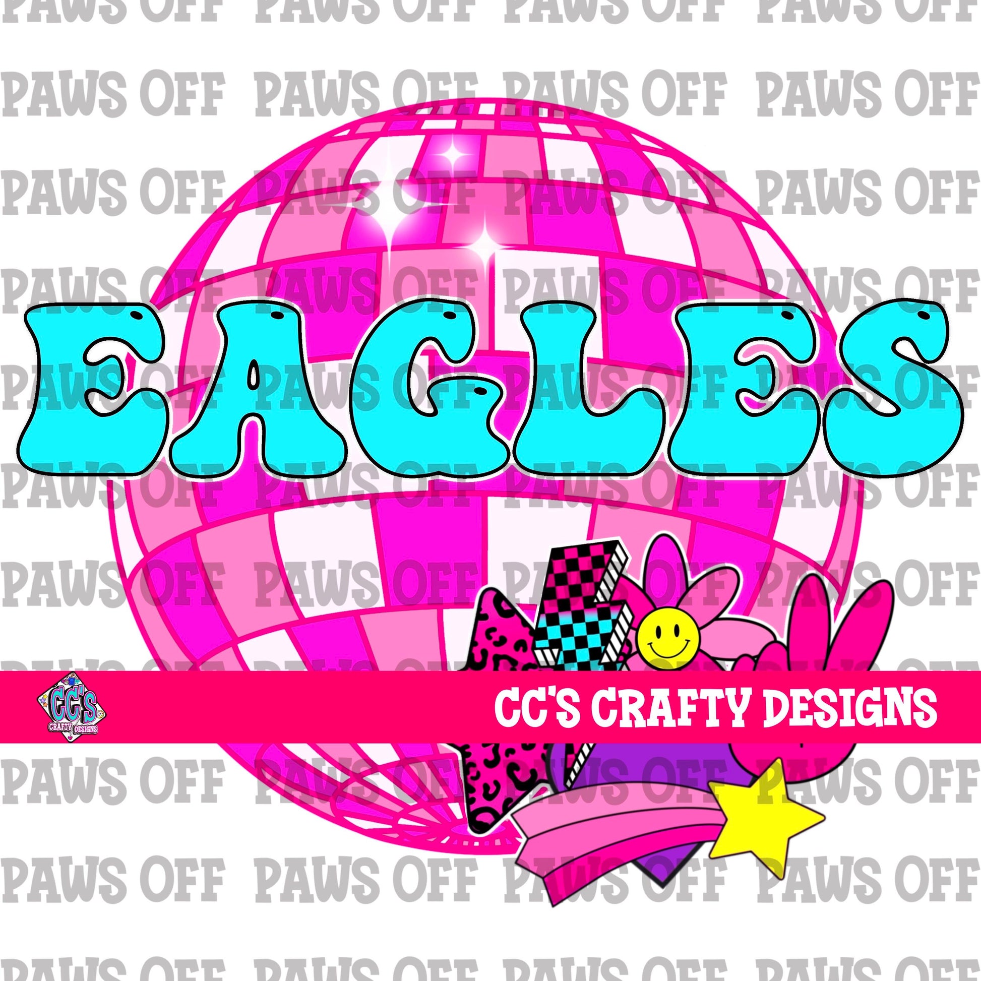Bring the funky retro vibes to your next project with this Eagles digital PNG! Featuring a vibrant pink disco ball, a groovy mix of peace signs, stars, checkered patterns, and a playful smiley face—this design is perfect for showing off school spirit with style and flair. Ideal for cheer teams, school merch, sublimation, t-shirts, tumblers, and more!