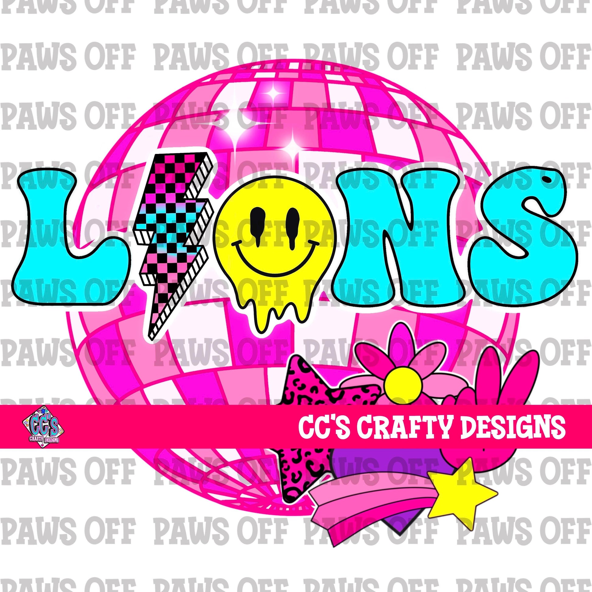 Bring the funky retro vibes to your next project with this Lions digital PNG! Featuring a vibrant pink disco ball, a groovy mix of peace signs, stars, checkered patterns, and a playful smiley face—this design is perfect for showing off school spirit with style and flair. Ideal for cheer teams, school merch, sublimation, t-shirts, tumblers, and more!