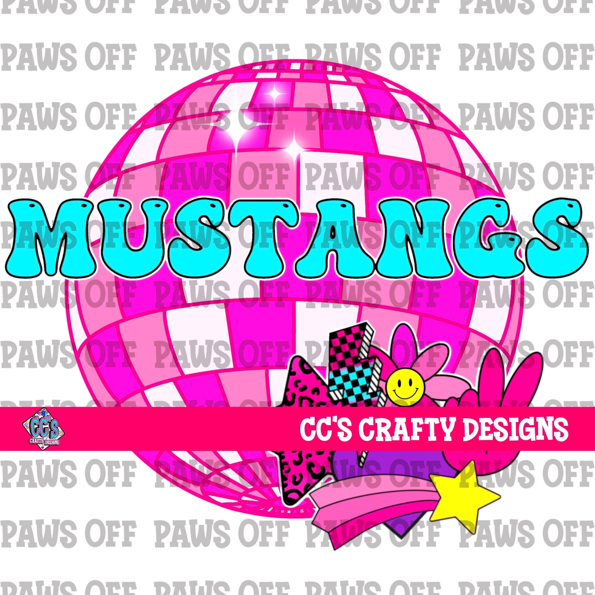Bring the funky retro vibes to your next project with this Mustangs digital PNG! Featuring a vibrant pink disco ball, a groovy mix of peace signs, stars, checkered patterns, and a playful smiley face—this design is perfect for showing off school spirit with style and flair. Ideal for cheer teams, school merch, sublimation, t-shirts, tumblers, and more!