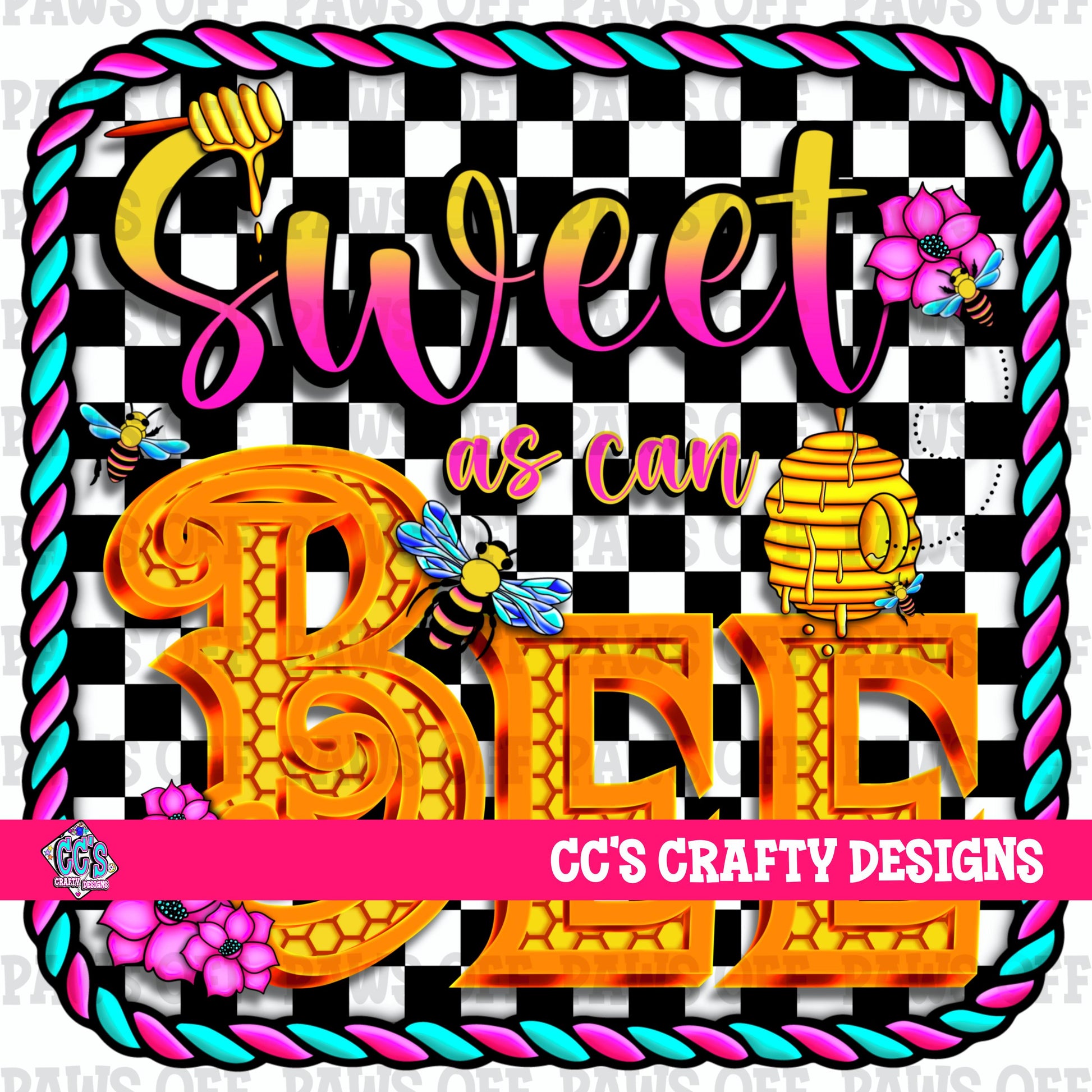 This vibrant, high-quality PNG is perfect for your next creative project! Featuring a fun checkerboard background, bright honeycomb lettering, buzzing bees, colorful flowers, and sweet honey accents — this design will add a playful and cheerful vibe to any item!