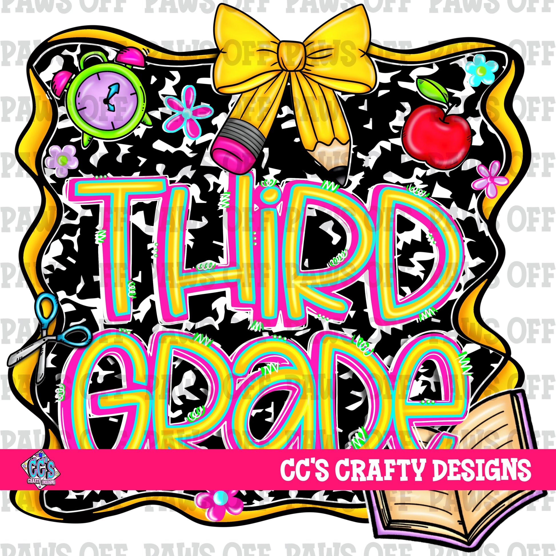 Start the school year in style with this colorful Third Grade PNG digital download — perfect for back to school shirts, teacher gifts, and first day of school crafts! This design features bold “Third Grade” lettering on a black-and-white composition notebook background, decorated with a pencil bow, alarm clock, school bus, apple book, and colorful flowers.